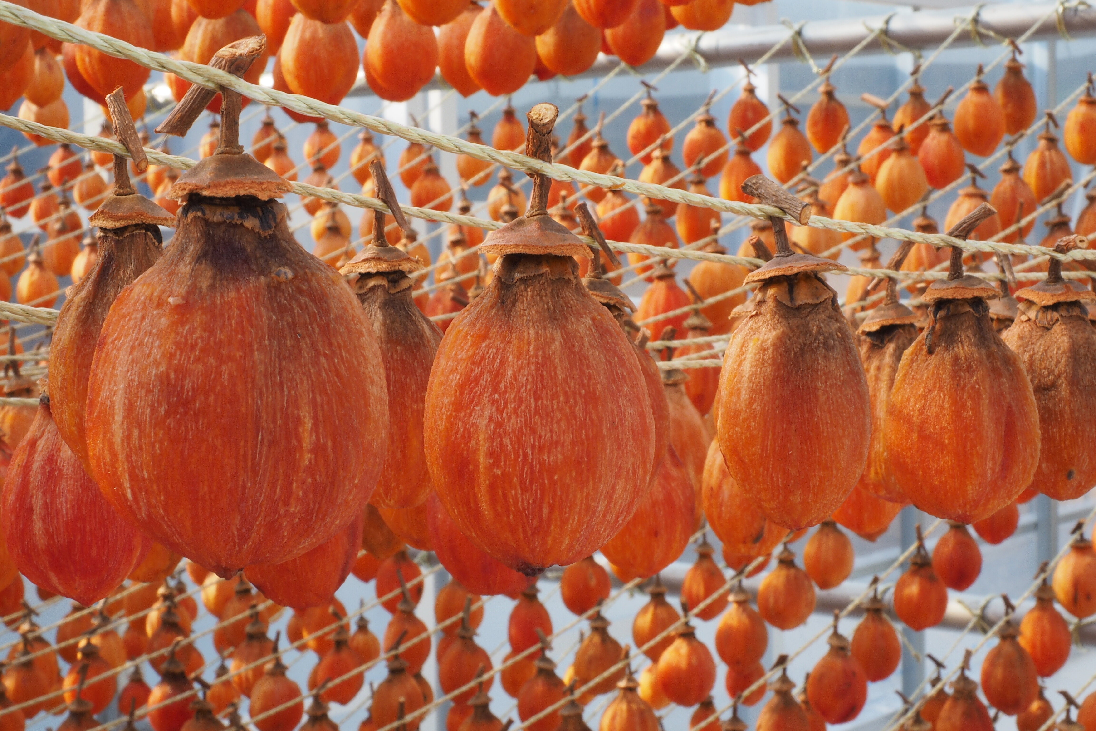 山ノ上地区は矢掛町の西部に位置し、標高が高く、秋の低温と無霧という条件を生かして、昔から干柿づくりが盛んに行われてきました。12月の第3日曜日には地域の方たちの協力により「山ノ上干柿まつり」が開催されます。
