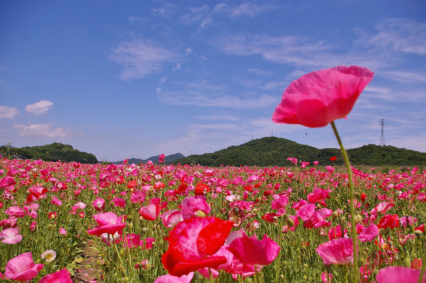 国内でも屈指の広さを誇る笠岡湾干拓地に四季折々の花畑が出現します。春は菜の花とポピー、夏はひまわり、秋はコスモスなど季節の花で彩られます。農産物直売所をはじめ、地元の食材を使ったレストランやソフトクリームなどがテイクアウトできるカフェもあり、ドライブの休憩スポットとしてもオススメです。