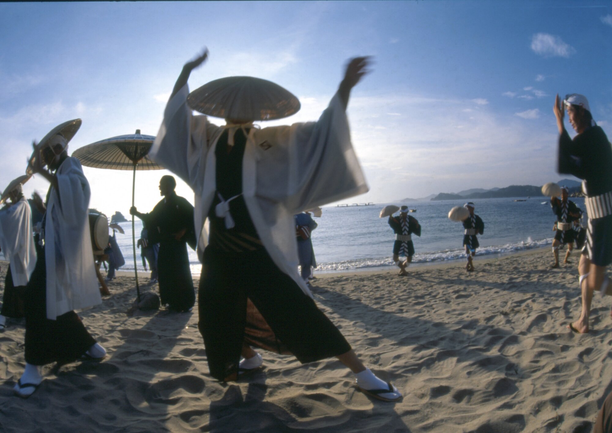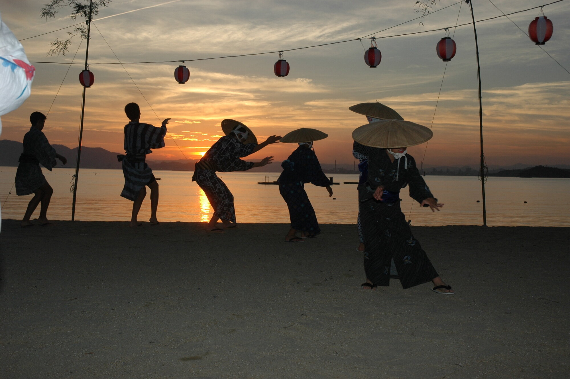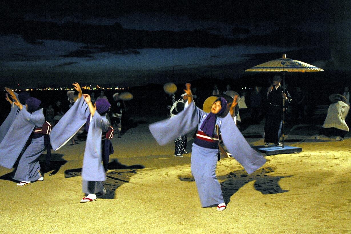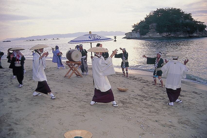 源平水島合戦で戦死した人々を弔うために始まったとされ、8月13日~16日の夜に行われる古式ゆかしい盆踊り。国指定重要無形民俗文化財にも選定され、大宮踊、備中松山踊りと並び岡山県下三大踊りのひとつともいわれています。ひとつの音頭に合わせて、男踊、女踊など十数種類もの踊りを舞うのが特徴です。
