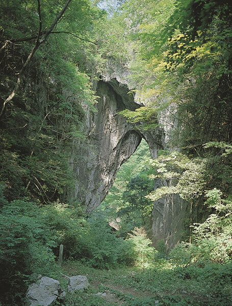 地下の洞窟だった場所(鍾乳洞)が一部を残して陥没し、高さ40mの石灰岩の巨大アーチとして残っています。洞口から吹き出す低温多湿な空気によって夏でも涼しく高山性や北方系のコケ植物なども見ることができます。